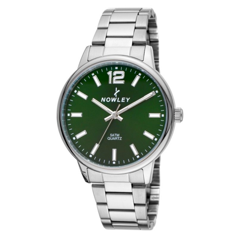 Reloj Nowley Hombre 8-7150-0-5 Acero Analógico. Caja de acero de 42mm de diámetro. Bisel plateado. Brazalete de acero inoxidable plateado. Cierre desplegable con pulsadores. Esfera verde. Cristal mineral. Movimiento quartz. Sumergible 50m. 3 años de garantía. Ref 8-7150-0-5