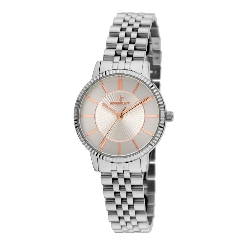 Reloj Nowley Mujer 8-7162-0-1 Acero Analógico. Caja de acero de 30mm de diámetro. Bisel plateado. Brazalete de acero inoxidable plateado. Cierre oculto con pulsadores. Esfera plateada con agujas e índices rose. Cristal mineral. Movimiento quartz. Sumergible 30m. 3 años de garantía. Ref 8-7162-0-1