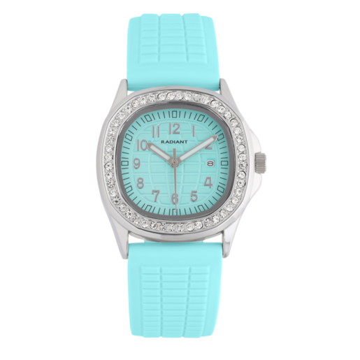 Reloj Radiant Mujer RA690206 Sport Turquesa Acero Analógico. Caja de acero de 34mm de diámetro. Bisel plateado con circonitas. Correa de silicón turquesa. Cierre hebilla. Esfera turquesa. Multifunción, calendario. Cristal mineral. Movimiento quartz. Sumergible 30m. 3 años de garantía. Ref RA690206