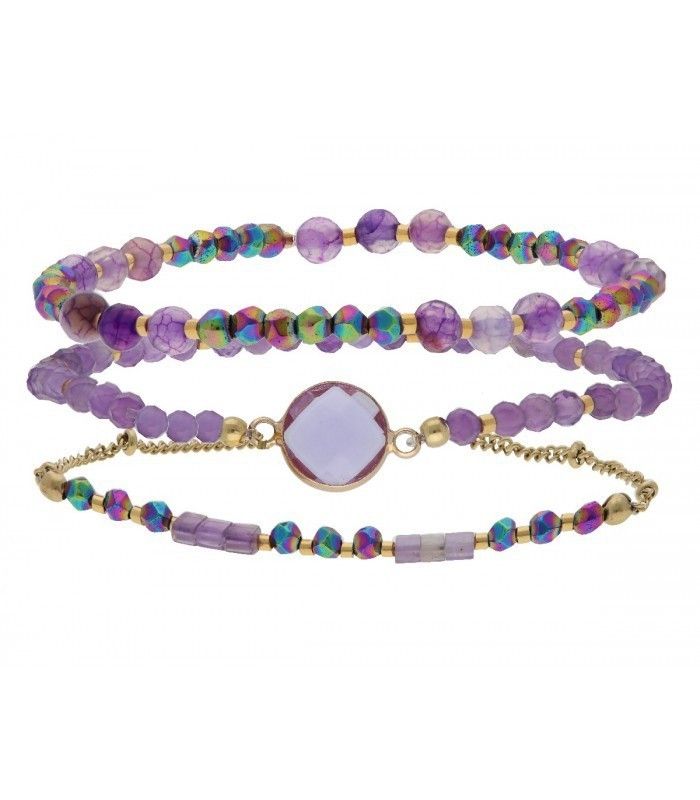 Set 3 Pulseras Acero Dorado Liska Mujer SHA181 Piedras Naturales Moradas