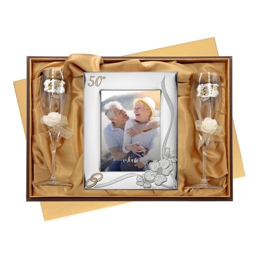 Set Portafotos Copas 18x24cm Aniversario EV9073/03C Alianzas Rosas 50 Años. Set de portafotos y copas conmemorativo de 50 años de bodas con rosas. Recuerdos de aniversario de bodas. Medidas 18x24cm. Ref EV9073/03C