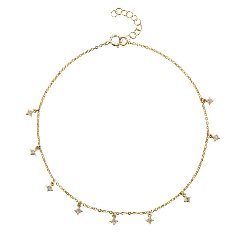 Tobillera Plata Dorada 22+3cm TOZ0008DOCZXX Rombo Circonitas. Tobillera fabricada en Plata Dorada de ley 925 con baño de oro 18kts. Cierre spring lock. Diseño de Rombo con circonitas. Medidas cadena 22+3cm. Medidas Colgante 3mm. Certificado de autenticidad y garantía de calidad en los materiales de fabricación. Ref TOZ0008DOCZXX